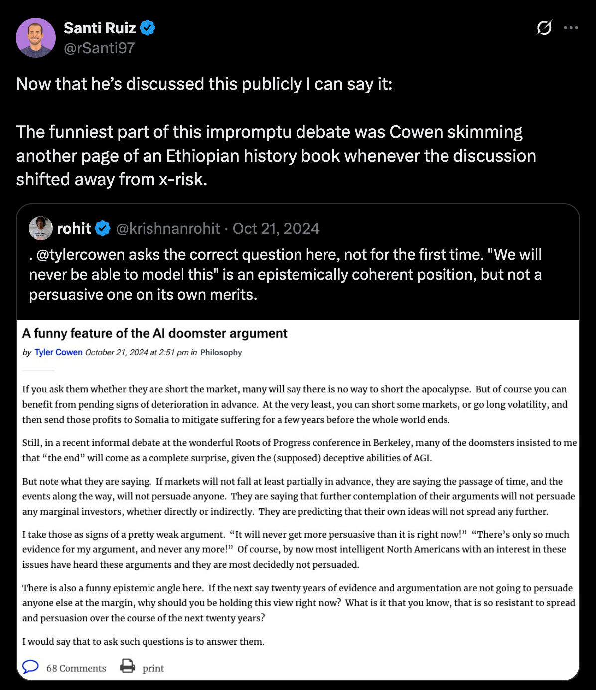 On the flip side, this year’s edition was missing a battle royale between Tyler Cowen and the Lighthaven rationalists on whether AI doom can be modeled economically.