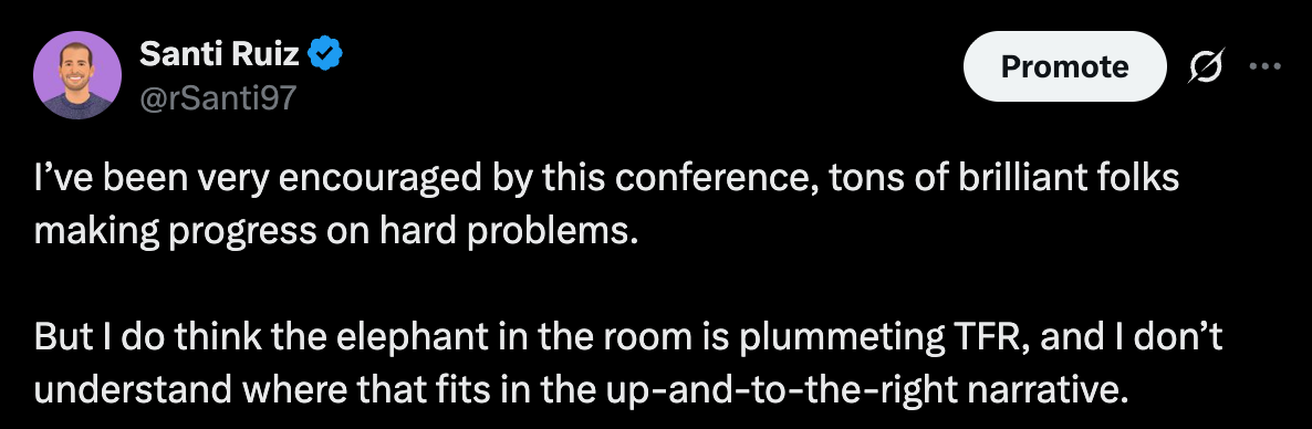 Last year, I thought global fertility was a strangely overlooked topic at the conference. This year, there were several scheduled conversations on the topic, and far more interest.