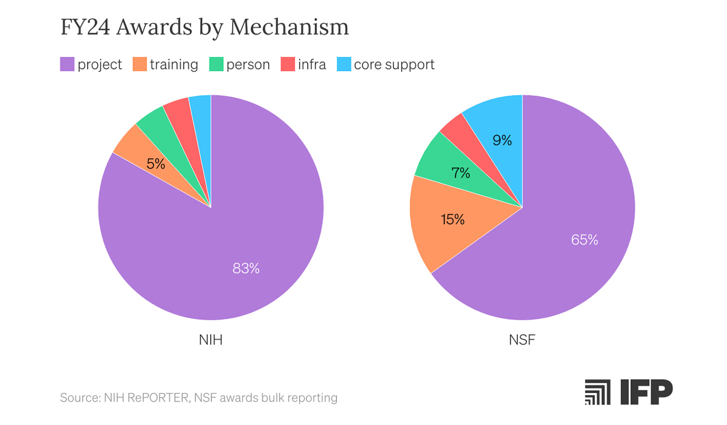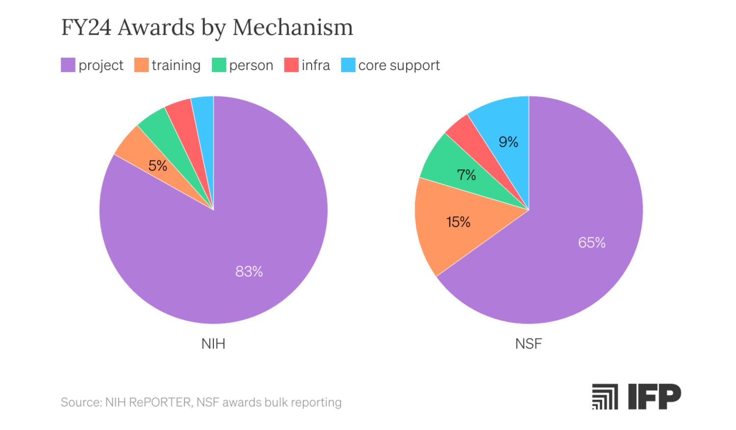 IFP co-founder Caleb Watney analyzed the American scientific portfolio, sliced along several axes. One stark conclusion: we may be overweighting project-based grants, relative to all the other ways one can fund science.