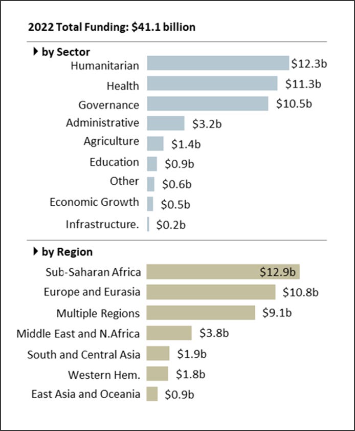 I'm looking at a chart of USAID program funding in Fiscal Year 2022: the three big buckets are humanitarian, health, and governance, all on the order of $10–12 billion. Way down at the bottom, there’s $500 million for “economic growth.” What's in that bucket that USAID funds, and should that piece of the pie chart be larger?